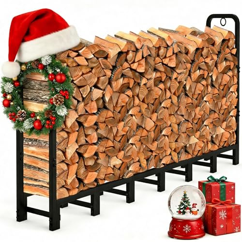 Amagabeli 8 ft Utomhus vedträstativ för eldstad Kraftig vedpål Förvaringsställ för uteplatsdäck Metallstockhållare Stativ Stålrör Stål Vedstaplare Utanför Verktyg Tillbehör Svart