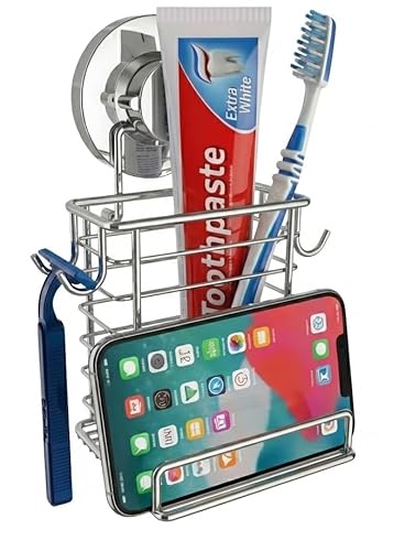 Toothbrush Holder Suction Cup Wall Mounted Toothpaste and Toothbrushes Holder with Powerful Vacuum or Adhesive System Rustproof Stainless Steel Organizer Electric Toothbrush (Silver)