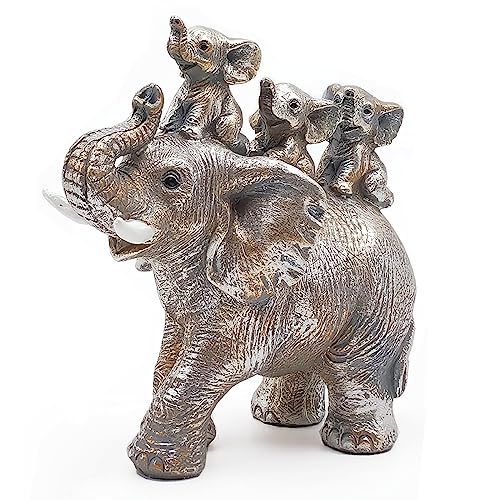Irayin elefantdekoration, elefant statyfigur, mamma gåva, elefantmor bär tre elefantbebisar på ryggen, dekoration för vardagsrum, kontor, bokhylla, sovrum – silver