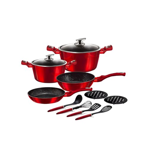 Wintem Set med 12 non-stick röda kokkärl och stekpannor i aluminium med 4 köksredskap och bekväma lock i härdat glas - kompatibel med alla matlagningsplattor som gas, induktion och elektisk