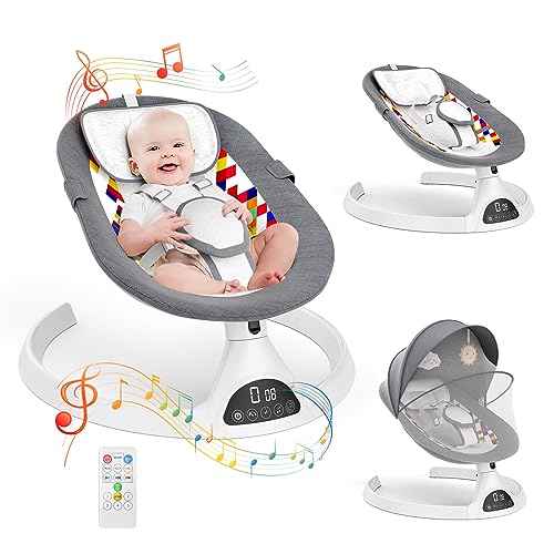 Hlieeosfcn Babygungbräda för barn, elektrisk babygungbräda med 5 naturliga gunghastigheter, elektrisk babygunga med musik, användbar från födseln upp till ca 6 månader, fjärrkontroll, grå