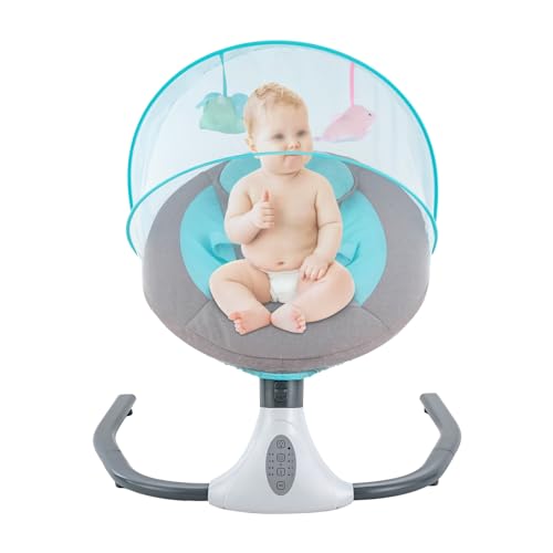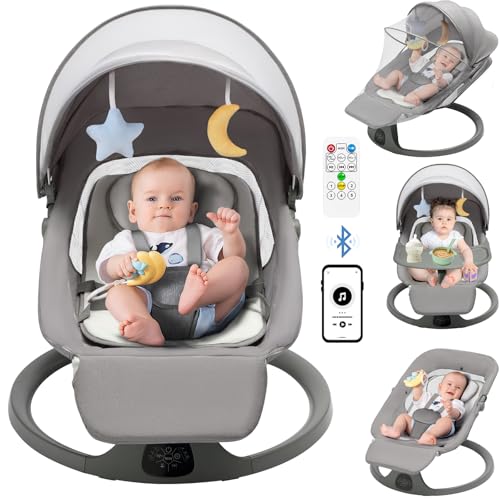 Hlieeosfcn Elektrisk babygunga, elektrisk babygungbräda med fjärrkontroll och appanslutning, babygungbräda med 5 vibrationsamplituder och timer, avtagbart myggnät och dold, för baby 0–6 månader