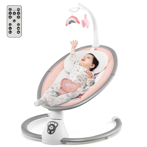 COSTWAY Elektrisk babygunga, babygunga med 5 gungnivåer, 3-stegs timerfunktion, 5-punkts säkerhetsbälte, leksaker, musik, fjärrkontroll, babygungbräda för baby upp till 6 månader (rosa)
