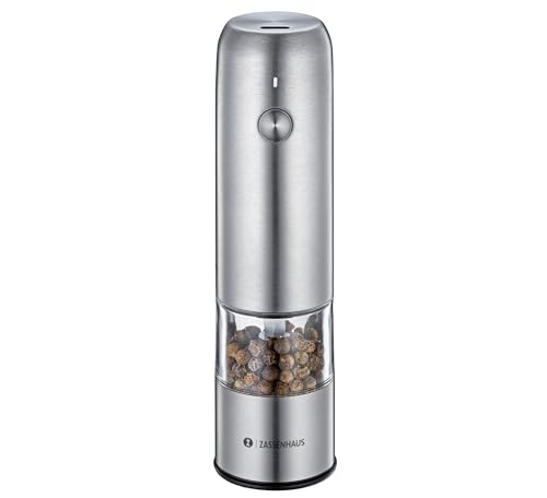 Zassenhaus Pepparkvarn KÖLN, elektrisk kryddkvarn, rostfritt stål, steglöst justerbar högpresterande keramisk kvarn, kvarn för peppar, salt, torkade örter, 14 cm, Ø 3,7 cm