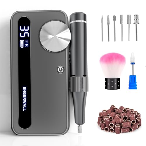 ENGERWALL Uppladdningsbar nagelborr 35 000 varv/min, bärbar trådlös elektrisk nagelfil för akryl, gelnaglar, polering och borttagning, med nagelborrkronor kit för manikyr och pedikyr, mörkt silver