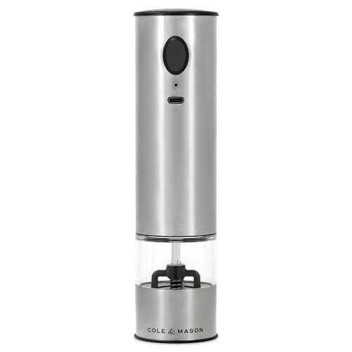 Cole & Mason Battersea Salt och pepparkvarn elektrisk, automatisk kryddkvarn, justerbar keramisk kvarn, 21 cm, rostfritt stål/akryl, elektrisk saltkvarn, USB-C, innehåller 1 x kvarn