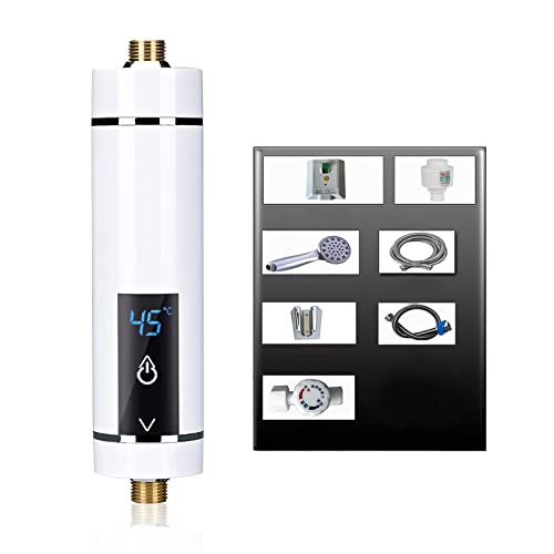 CJHZQYY Mini elektronisk varmvattenberedare tanklös elektrisk varmvattenberedare, mini omedelbar varmvattenberedare genomströmningsvärmare för badrum kök, LED stor skärm (vit, 3 500 W utan duschset)