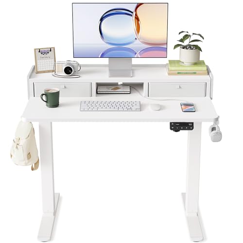 YIHAYO Höjdjusterbart skrivbord med lådor och monitorstativ 100 x 60 cm, elektriskt skrivbord, ståskrivbord med minnesfunktion, vitt