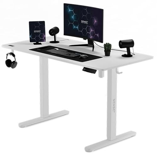 SENSE7 Höjdjusterbart skrivbord, elektriskt NOJO, stående skrivbord, 120 x 60, PC-bord med minne, ståskrivbord med kabelbricka, spelbord med krokar, tyst höjdjustering, vitt