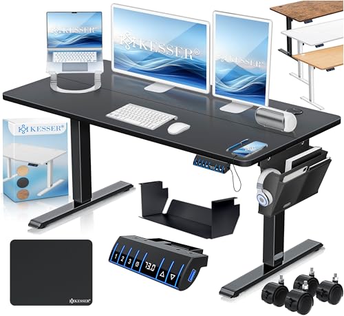 KESSER® Höjdjusterbart elektriskt skrivbord 120 x 60 cm, ergonomiskt höj- och sänkbart skrivbord, 3-funktions-minnesstyrning, inkl. 360° hjul och USB-laddningsport, datorbord för hemmakontor