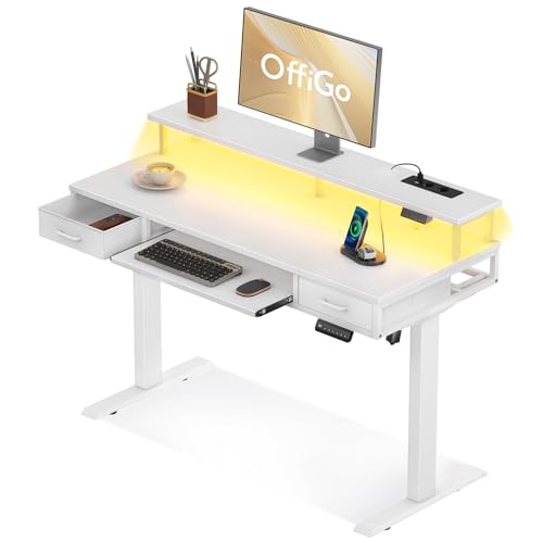 OffiGo Elektriskt skrivbord med lådor, 120cm Höjdjusterbart skrivbord med monitorstativ, Stående skrivbord med eluttag och ljuslist, Standing Desk, Vit
