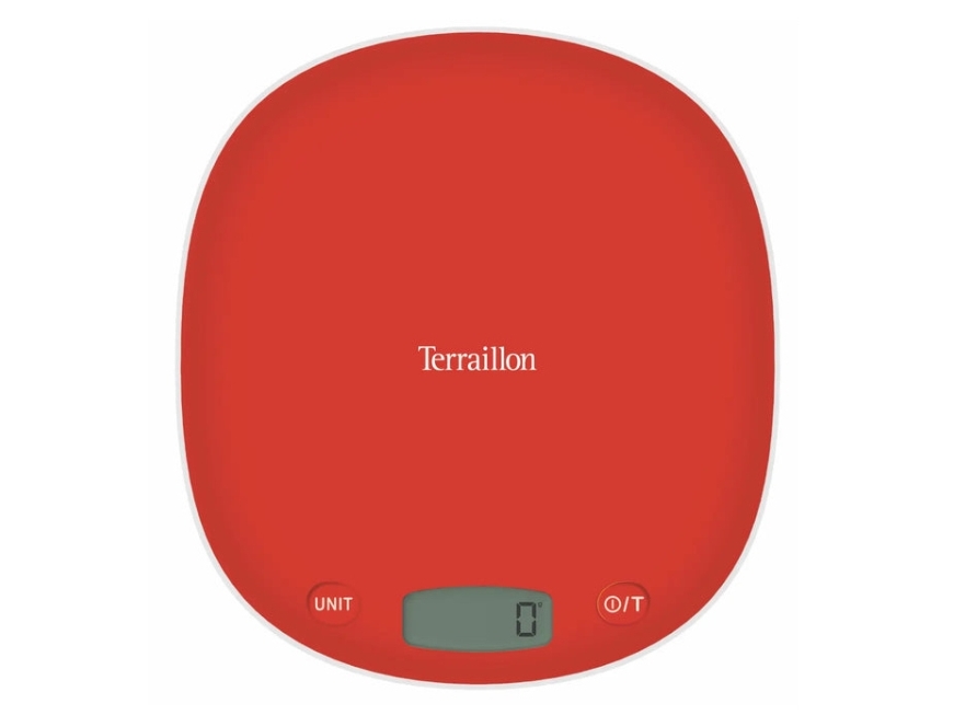 TERRAILLON - T1040 FOOD LOVE- elektronisk köksvåg, glasbricka, kapacitet 3 kg, gradering 1 g, tara, flytande omvandlingar, ultratunn och kompakt - LCD-skärm - röd