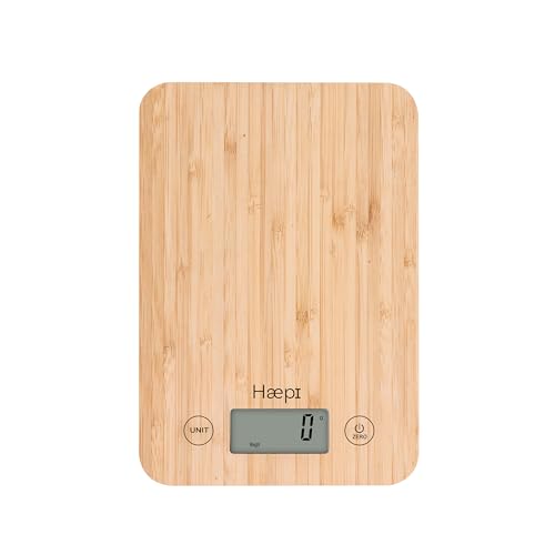 Haepi, Elektronisk köksvåg i bambu med hög precision 5 000 g/1g, tarafunktion, flytande funktion, design, bambubricka, batterier ingår, 15 års garanti