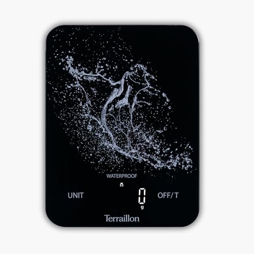 TERRAILLON AQUA RESIST - elektronisk köksvåg, IP67-vattentät, magisk LED-bakgrundsbelyst skärm, kapacitet 8 kg, 1 g gradering, batterifri, USB-C-laddning, svart