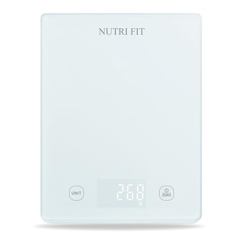 NUTRI FIT Digital elektronisk köksvåg i härdat glas, 3 kg-1 g, g/ml enheter för matlagning, stora LCD-avläsningar, AAA-batterier, vit