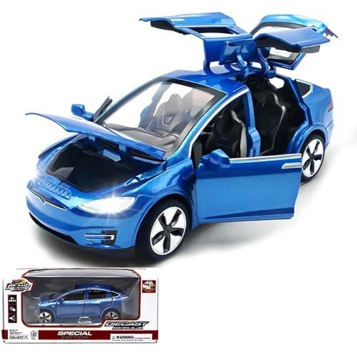 TOPRON Modellbil Tesla Model X 1:32 skala, formgjuten legering elektronisk leksak med retryckningsfunktion, med ljus och musik, minifordonsleksak som present till barn (blå)