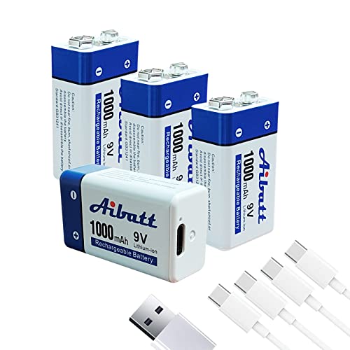 Aibatt 9 V blockbatteri 1 000 mAh med laddningsport typ C, Li-ion 6F22 uppladdningsbart batteri för mikrofon, rökdetektor, elektronisk leksak, walkie-talkie, rökdetektor, 9 V blockbatterier (4