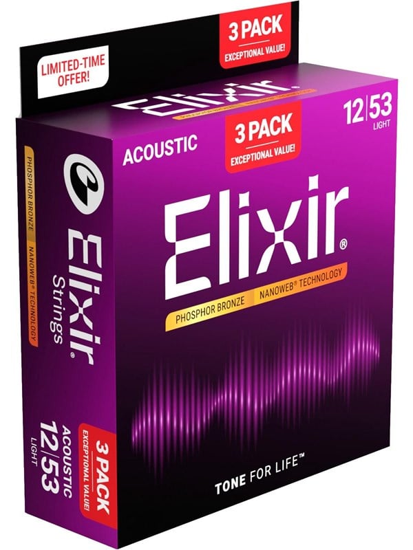 Elixir Strings Acoustic Phosphor Bronze Nanoweb Light 12-53 - 3 Pack