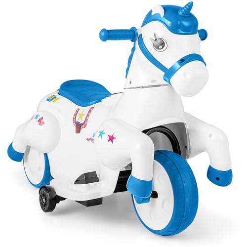 COSTWAY Elektrisk motorcykel barn, elmotorcykel, 2 lägen, gunghäst med musik och LED och stödhjul, 3 km/h, elfordon för barn från 3 år (blå)