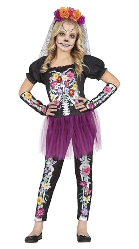 FIESTAS GUIRCA Blommig skelettdräkt - klänning med Tutu, byxor och handskar med blomtryck för flickor i åldrarna 3-4 år