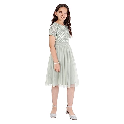 Maya Deluxe Midi-klänning för flickor, paljetter, utsmyckad, fest, tutu, brudtärnor, bröllop med bältesrosett, Dimmig grön, 3-4 År