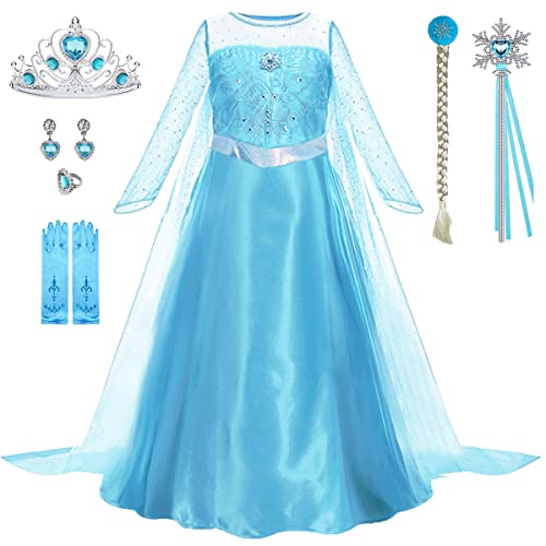 Vicloon Elsa prinsessklänning för barn, 9 st prinsessa, Elsa-klänning, snödrottning Elsa, med magiska stavtillbehör, prinsessa, krona - 100 cm, 6 olika storlekar
