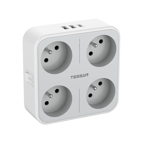TESSAN Fransk vägguttag med 4 AC-utgång och 3 USB-portar, 7 i 1 eluttag 4 000 W med strömbrytare, USB C-nätverk grå lämplig för hem, kontor, kompatibel med telefon, pad