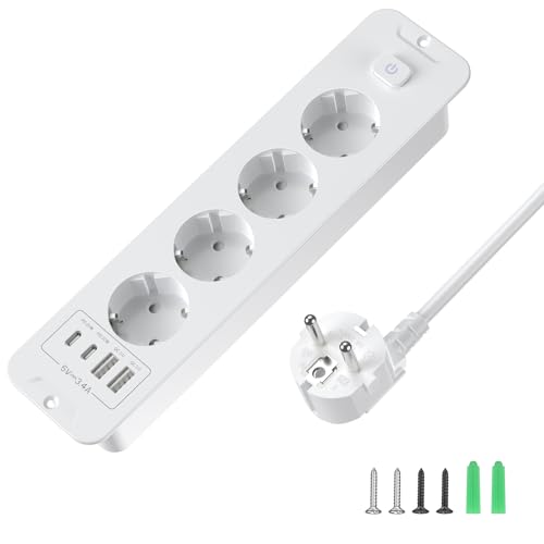 JSVER Multipeluttag 3680W 16A Med 4 USB-portar, Överspänningsskydd med 6 Eluttag och Strömbrytare, Väggmonterad för Hemmakontor,Resor Kompatibel med Telefon3M-Vit