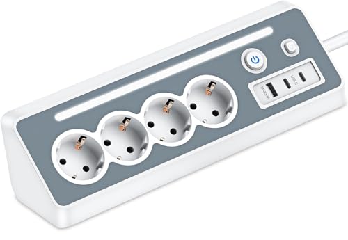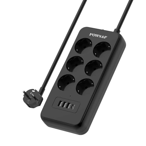 POWSAF Uttagsregulator med USB-C-port, 4 x eluttag, 3 USB-A-portar och 1 USB-C-port med strömbrytare, lämplig för arbete hemifrån – svart
