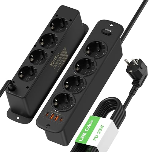 Infälld grenuttag med 8 uttag med USB C PD 20 W och strömbrytare, infällt eluttag med 4 USB för bänkskiva, bord eller möbler, dubbelsidig infälld kontakt - svart, 2 m kabel
