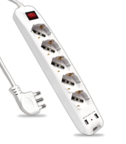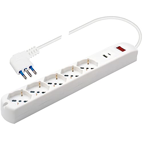 Bticino Pokerströmsuttag med 6 platser, 2 USB-uttag och 4 mångsidiga uttag (Schuko 10/16 A och dubbelsteg), eluttag med strömbrytare, 1,5 m kabel, 16 A-kontakt, robust och platsbesparande,
