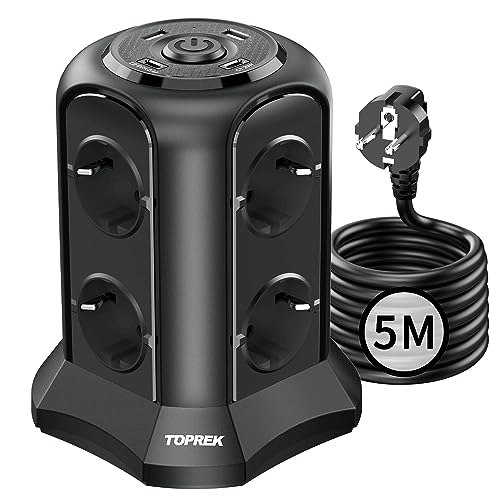 Multikontakt med strömbrytare, TOPREK 8 eluttag med 2 USB-A och 2 USB-C(USB C1 20W PD3.0 snabbladdning), 4 000W/16A, avledare och 5 m kabel för hem och kontor (svart)