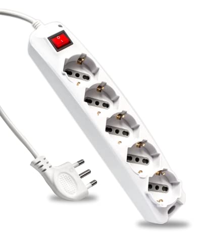 V-TAC Strömuttag med strömbrytare och kabel på 1,5 meter, 5 uttag 10/16 A dubbelsteg + shuko – 16 A-uttag – eluttag för hem, kontor, tält – vit