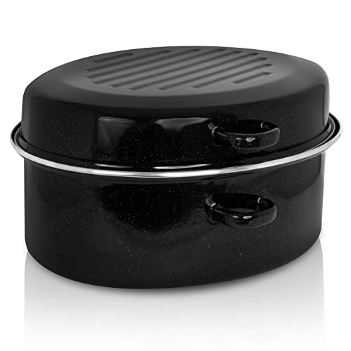 Krüger Emaljgryta med dropplock – högkvalitativ gryta – lämplig för alla typer av spisar – perfekt för stekning och fjäderfä (emalj – svvitspräcklig med kromkant (42 x 32 cm))