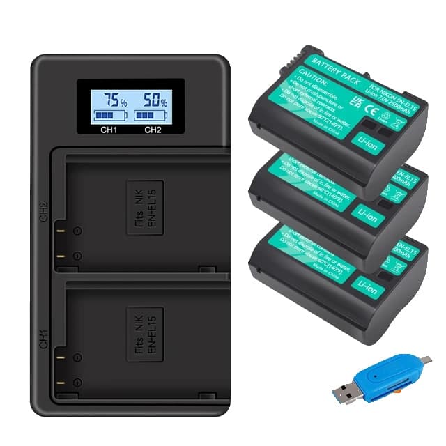 Nikon EN-EL15 batteri, dubbel USB-laddare, LCD-skärm, 3 batteri och laddare