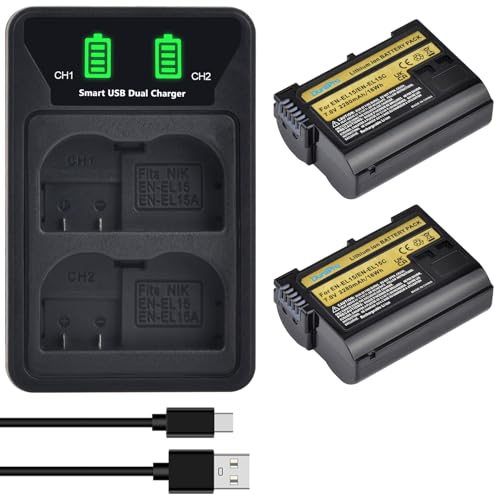DuraPro 2 st EN-EL15 EN-EL15C batteri + LED dubbel USB-laddare med typ C-port för Nikon EN-EL15 EN-EL15A Z6, Z7, z8, D850, D810A, D800, D7500, D7200, D7100, D710, D77710, D777710, D710, D710, D7710