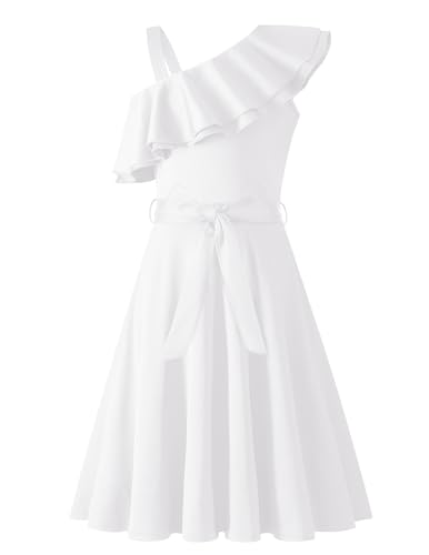 Arshiner Flickor Klänningar Enaxlad Barnklänningar Sommar Ärmlös Klänning Volang Hals Elegant Festfestivalklänningar Gunga med Bälte Klänning för flickor 5-13 år, Vitt, 9-10 År