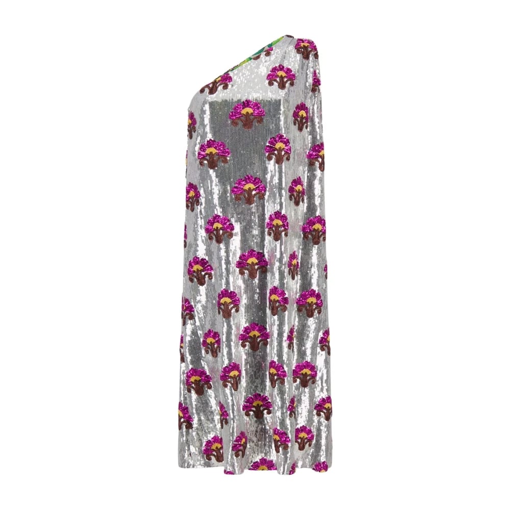 La DoubleJ, Klänningar , Dam, L, Polyester, Silverblommig Enaxlad Midiklänning