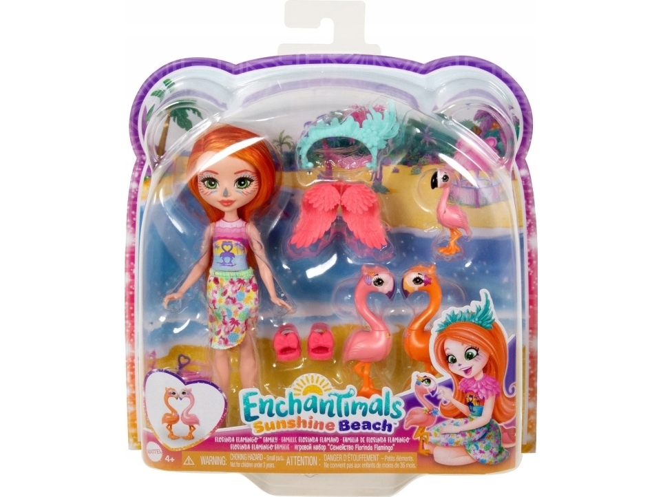 Enchantimals Sunshine Beach-set med docka och familj, med Florinda Flamingo som liten docka, kompisen Twig och två djursyskon som kan bilda ett sött hjärta, HRX85