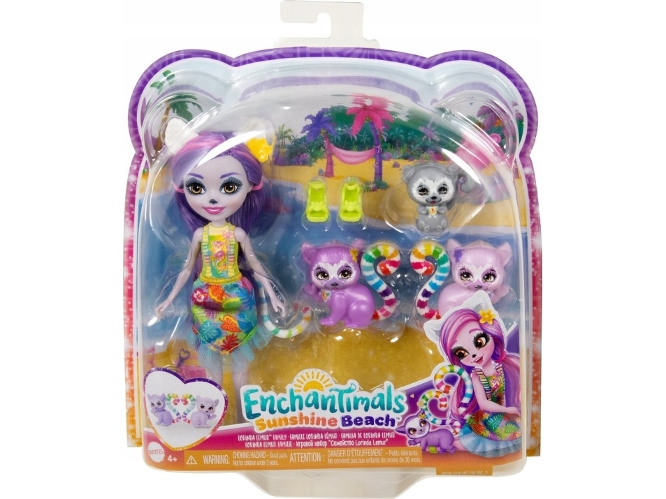 Enchantimals Sunshine Beach-set med docka och familj, Lorinda Lemur som liten docka, kompisen Ringer och två djursyskon som kan bilda ett sött hjärta, HRX86