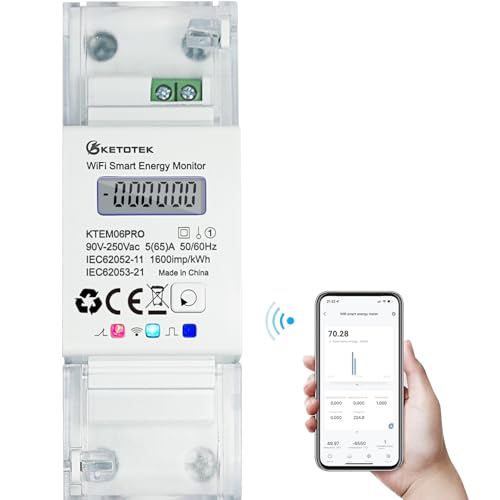 KETOTEK Smart Elmätare, Wi-Fi, DIN-skena, 1-fas dubbelriktad mätning, Digital Energimätare 5(65) A 90-250V, KWh-mätare Kompatibel med Alexa/Google Assistant, Datalagring, Solcellsövervakning