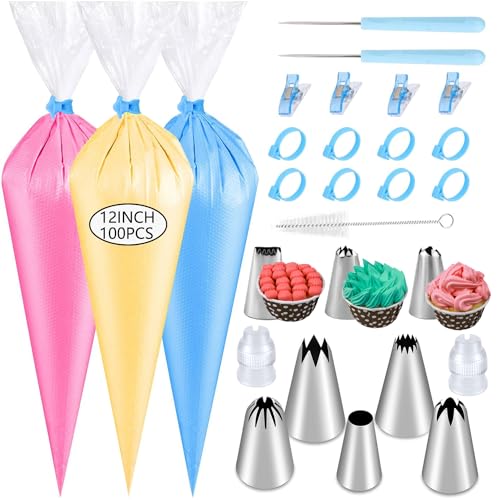 GZMAISULEE 125 st spritspåsar, spetsuppsättning, tjocka bakverkspåsar, engångs 12 tum, 100 st med 8 glasyrpåsar och 8 glasyrspetsar, 1 borste, 4 väskklämmor, 2 skribernål för kakkakkaka muffins