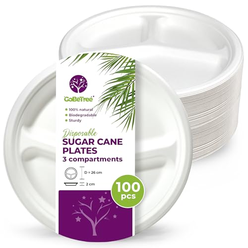 100 engångstallrikar 26 cm med 3 fack Tallrikar av sockerrör, Extra robust vit engångsservis, Runda tallrikar