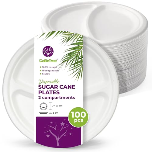100 engångstallrikar 23 cm med 2 fack Tallrikar av sockerrör, Extra robust vit engångsservis, Runda tallrikar