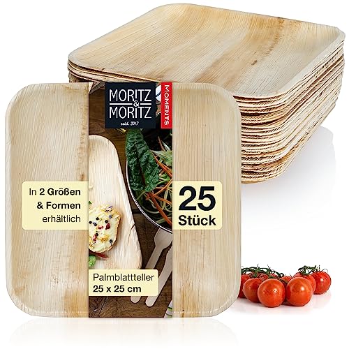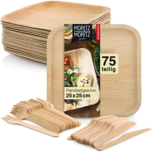 Moritz & Moritz 75 delar hållbart porslin med palmblad – 25 engångstallrikar – 25 engångs-träbestick – alternativ till bambutallrikar och bambuporslin