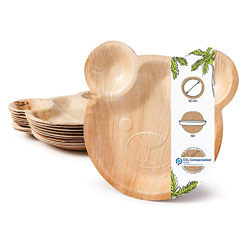 GREENBOX Palmware Party barnfödelsedag, tallrik i söt björndesign I 12 stycken palmblad, engångstallrikar 22 x 24 cm I engångsservis tallrik stabil, 100% biologisk och helt komposterbar, beige