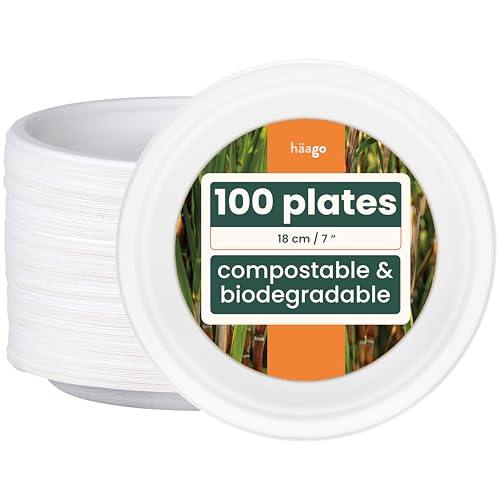 Komposterbara tallrikar, storpack, 125 st, 100 % komposterbara, 18 cm, kraftiga, miljövänliga engångstallrikar i sockerrörsmaterial