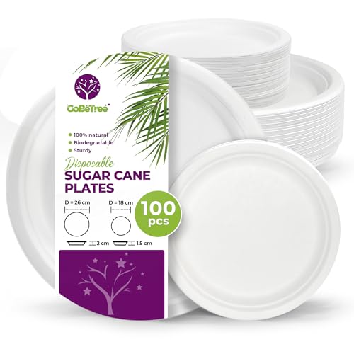 100 Stabila Papperstallrikar i Sockerrör (⌀ 26 cm) - Mikrovågsugnssäker, Miljövänlig, Biologiskt Nedbrytbar - Festtallrikar, Engångstallrikar för Picknick, Bufféer, Grillfester