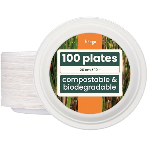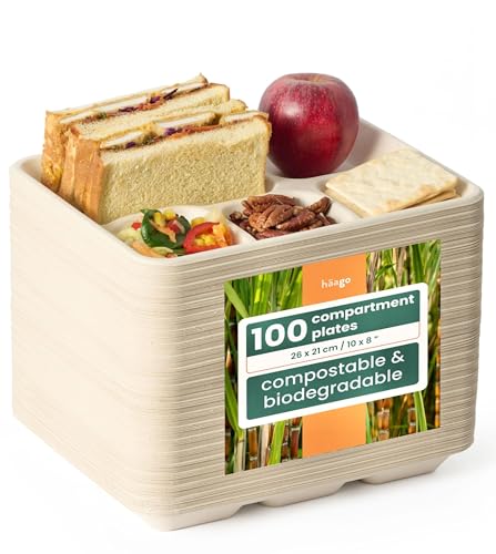 HAAGO 100 engångstallrikar, 26 x 21 cm, portionskontroll, 5 fack, matsockerrör, bagasse papper, uppdelade, varm- och kallmat, biologiskt nedbrytbar och komposterbar