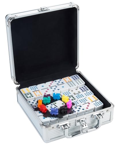 Engelhart – 250160 – Mexikansk Tåg Domino D12 – Aluminiumväska med tillbehör – Komplett set – 91 brickor – 2–8 spelare